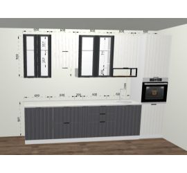 Размер кухонного гарнитура: Ширина левой стороны 3000 мм. Ширина правой стороны 1700 мм. Высота 2336 мм. Глубина 600 мм. (с учетом столешницы)